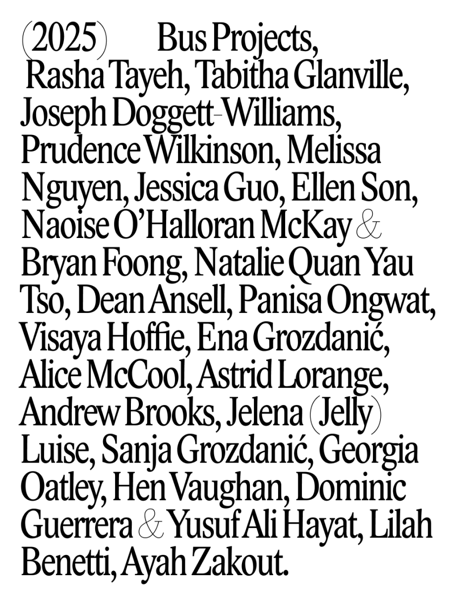 Bus Projects is very excited to announce the artists and curators that make up our 2025 artistic program at Bus Projects, with the first exhibition of the year opening in late March. The program this year was selected by our wonderful Artist Committee team, Mohamed Chamas, Jemi Gale, Jenna Lee, Roberta Joy Rich, Daisy.