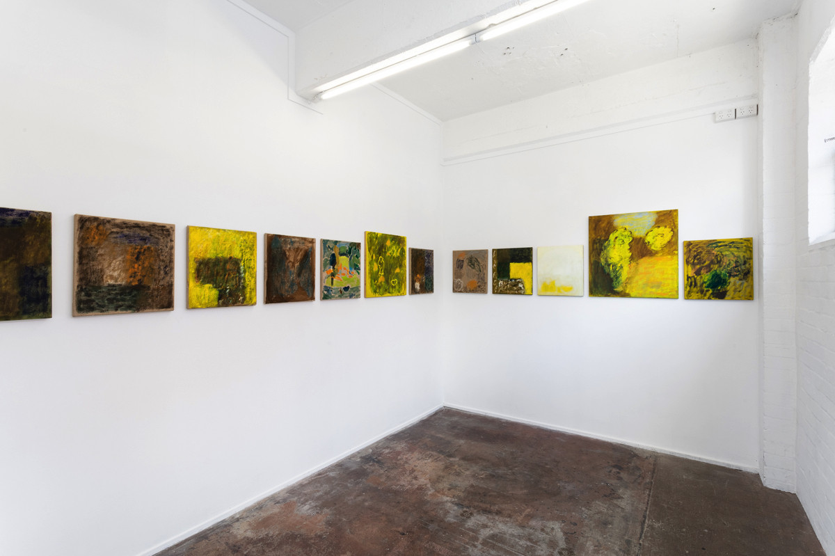 The surface of each painting become a charged space through the use of coarse linen and hessian, and are often saturated with an iconic yellow hue. What then follows is an intuitive process of applying and removing paint, pouring, rubbing and layering, all situated within a unique language of figure-ground dynamics. Through these actions, Eleanor’s canvases become diaristic sites for posing questions and receiving answers whilst generating agency through an intimate and reciprocal relationship between artist and object.