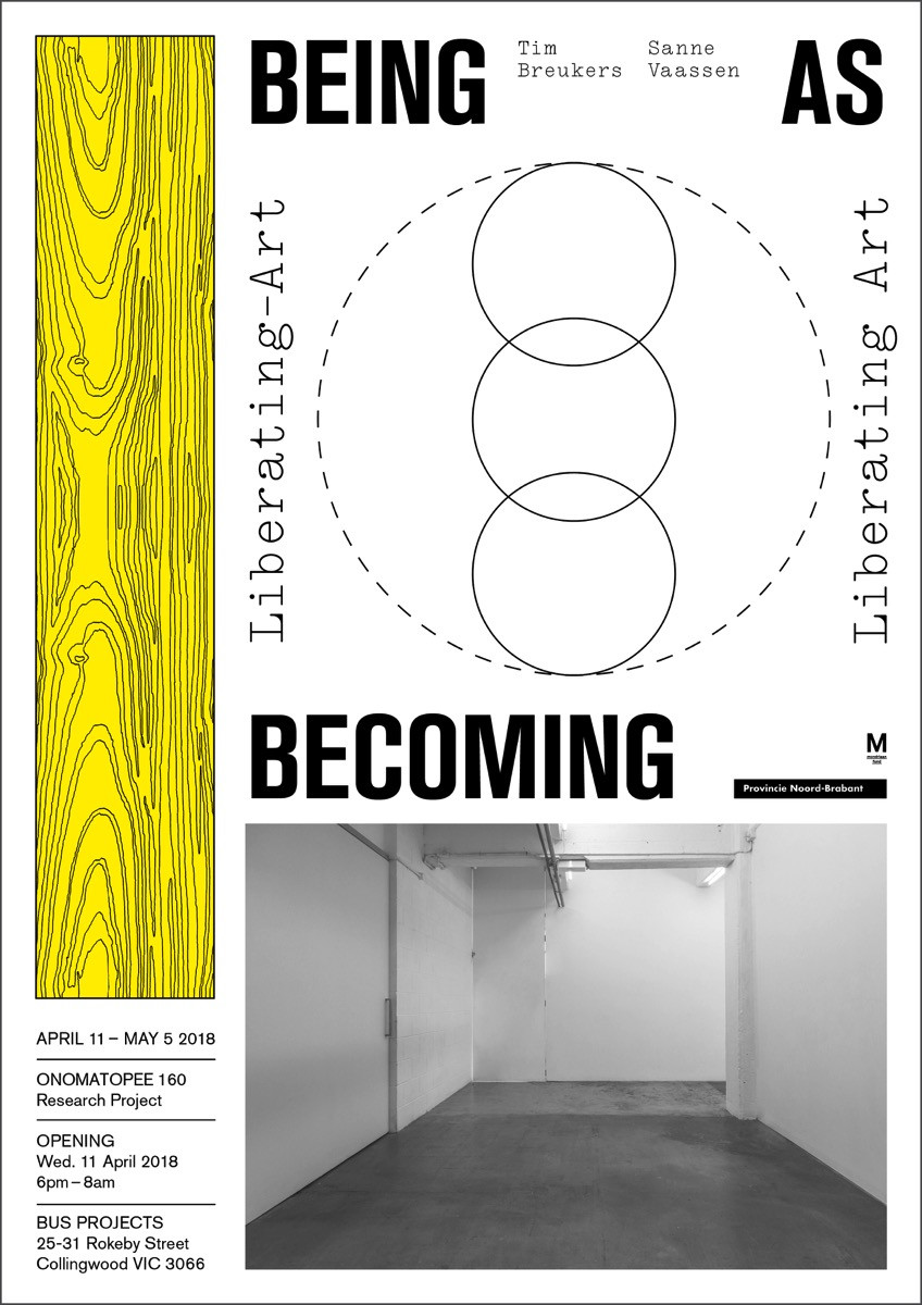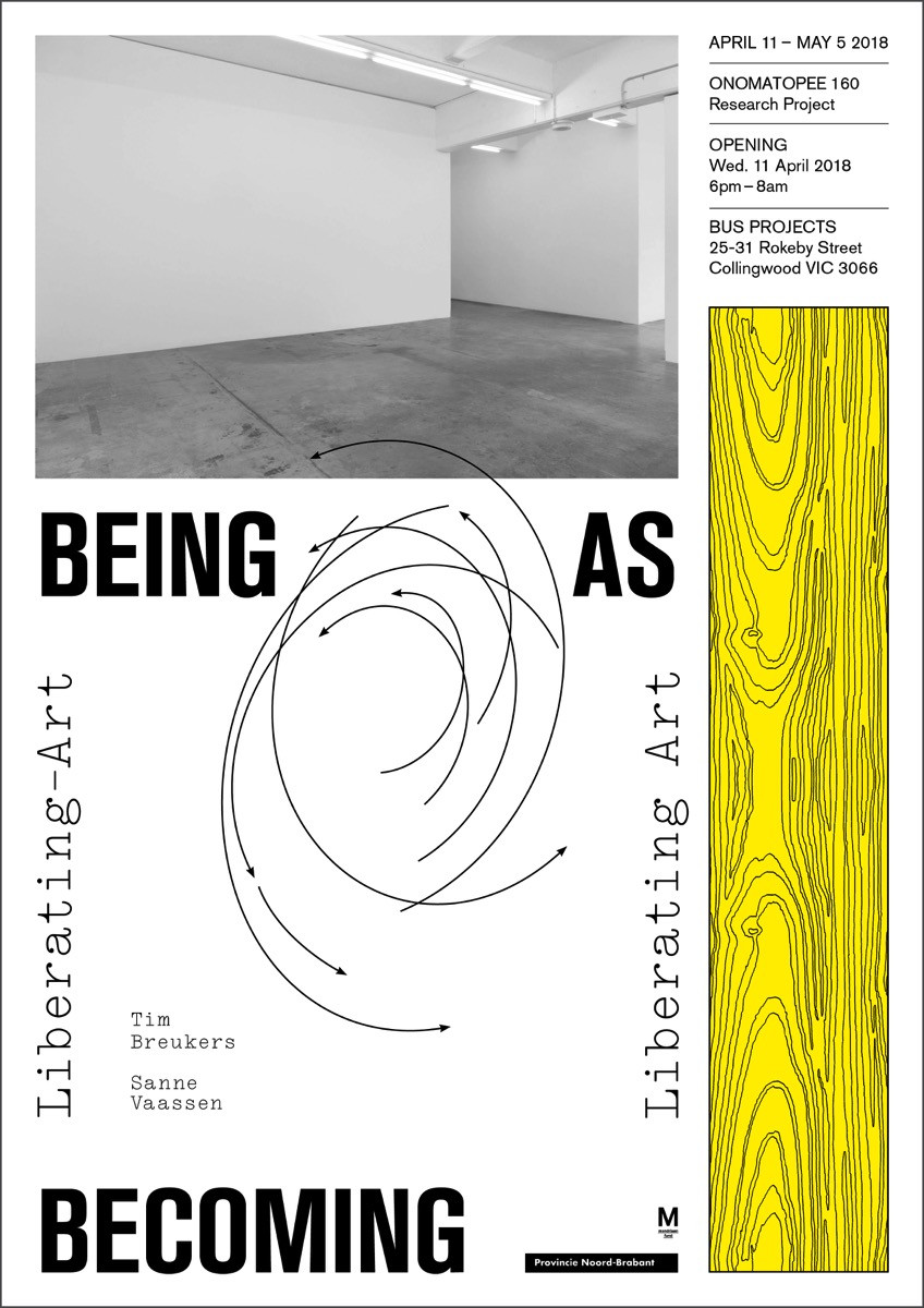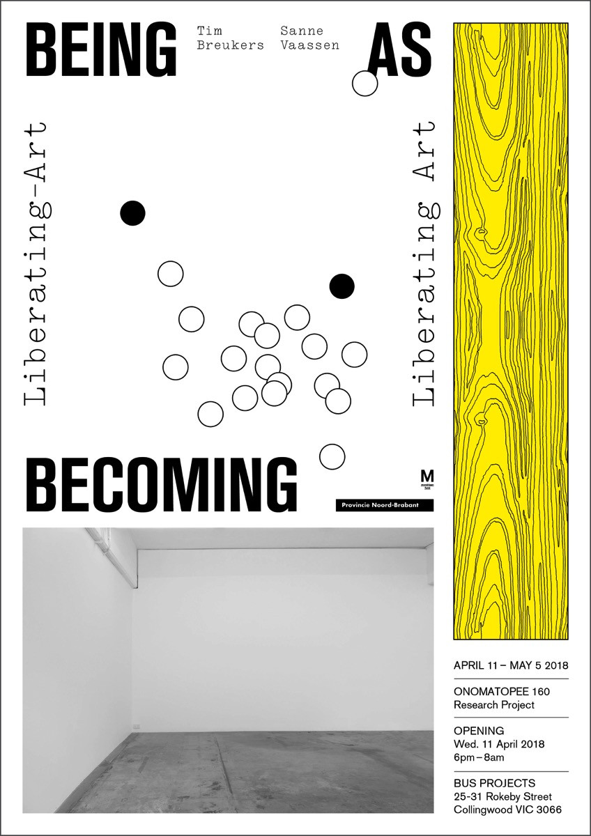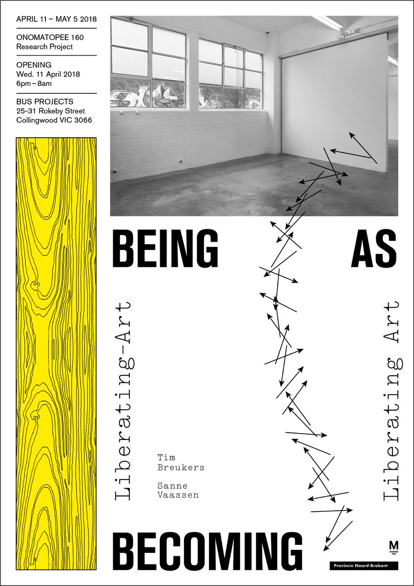 “being as becoming: liberating-art and/or liberating art” is a collaboration between public gallery and publisher Onomatopee (NL) and artist-run space Bus Projects (AU). The project integrates notions of ‘the contemporary’ and aims to assert the added qualities of artistic production in our life. Does art liberate and/or should it be liberated?