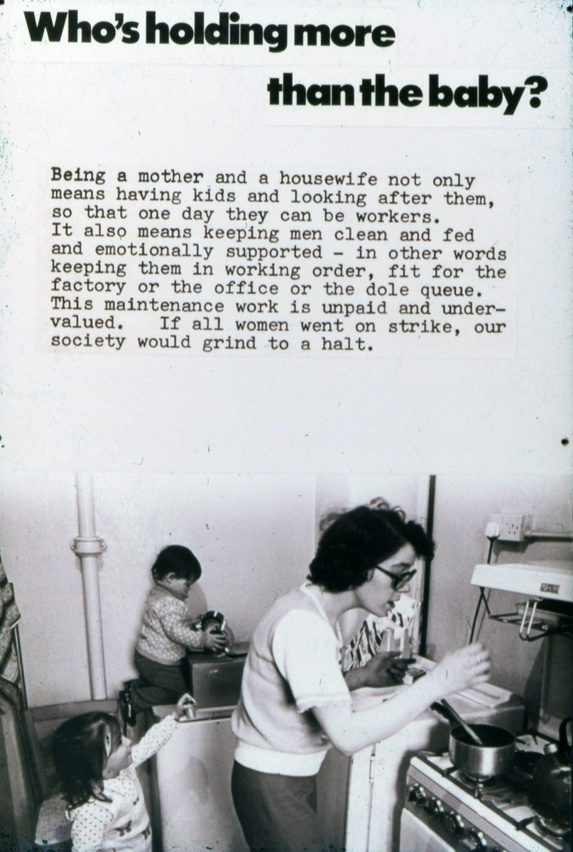The Hackney Flashers were a London based socialist-feminist photography collective active from 1974 to 1980. They produced educational and campaigning material including two exhibitions, Women and Work (1975) and Who’s Holding the Baby (1978), which featured black and white photographs, montage, text and cartoons on portable laminated panels. These multi-panel photo-text exhibitions appeared in a range of alternative and community venues, such as the Hackney Town Hall, health centres, libraries, schools, trade union and feminist events. Their agit-prop panels focused on women’s experiences of work and drew attention to the lack of childcare provision available to women in Hackney, East London.