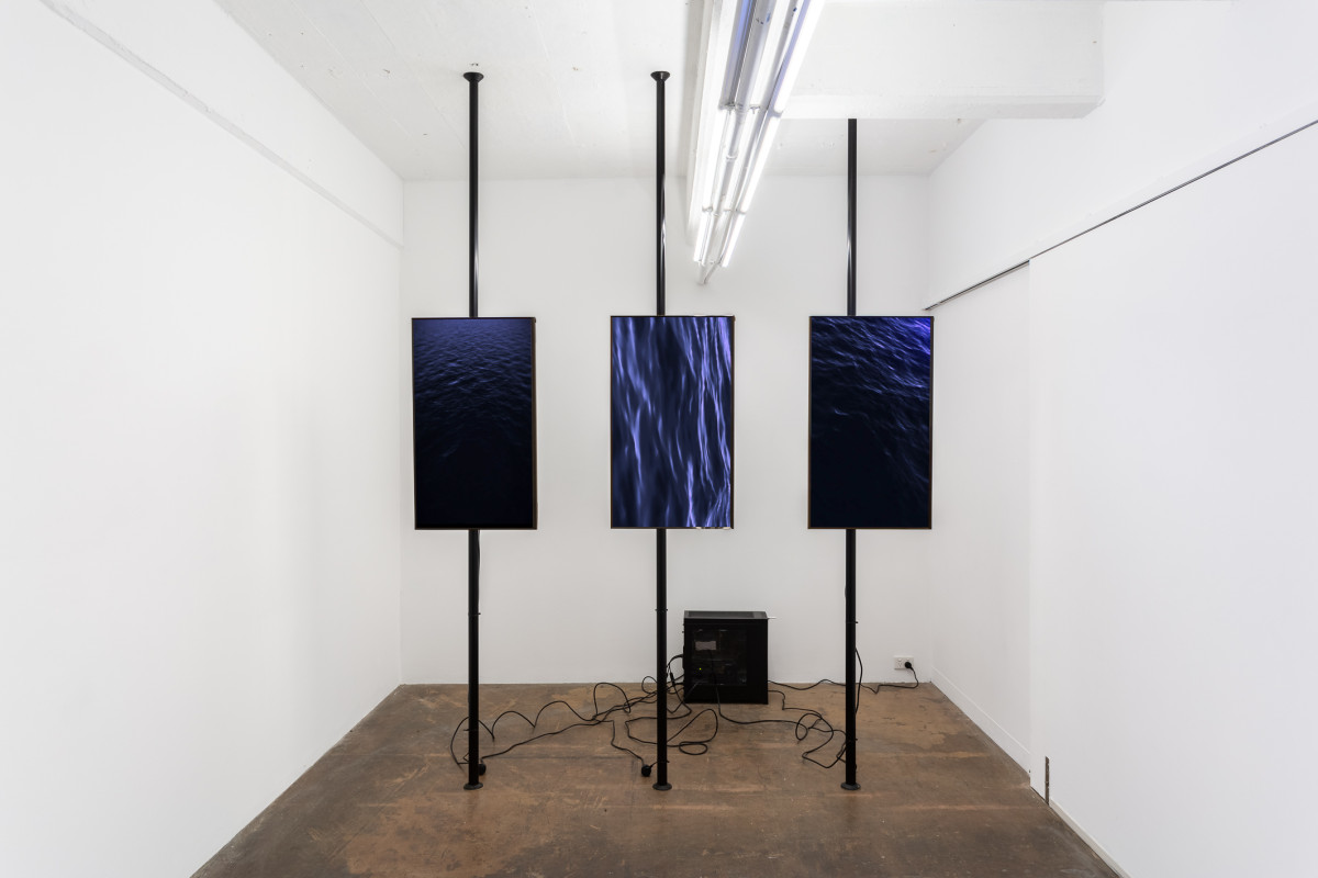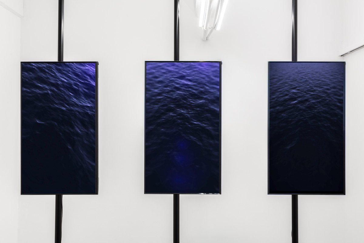 ‘endless oceaning-image’ examines the impact of generic, popular, and widely-reproduced imagery on the sublime landscape. It is the latest in a series of related exhibitions by Oliver Hull. This iteration deals with the Marianas Trench, the deepest point of the Earth’s oceans. It is a landscape we know less about than Mars, leaving it open to hauntings from various fictions and images. ‘endless oceaning-image’ appropriates visual languages from the most dominant segments of this murky image-place. The exhibition is a 3 channel live simulation created using a video game engine, controlled in real-time using weather data from the Marianas Trench region. The conditions of the weather such as wind speed and rainfall change the animation of the water (When it rains there, it rains in the game). These conditions also control a generative soundtrack, samples and camera effects, to create something likened to an ambient film. ‘endless oceaning-image’ gives the Marianas Trench some agency of its own representation to consider the push and pull between images and objects as they relate to landscapes colonised by their image.