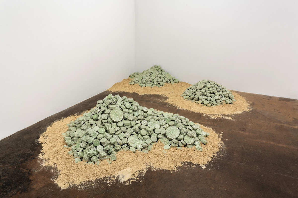 Consisting initially of 888 celadon glazed mooncakes cast from traditional hand carved moulds sourced from North Vietnam; Mooncake is an ongoing 10-part work examining the historic expansionism of China. Utilising the mooncake, a ubiquitous cultural item in Asia that has its origins in China, the work comments on shared cultural values while critiquing China’s current position on and in the South China Sea. With each reiteration of the work a further 888 mooncakes will be added, expanding the work in direct response to the ‘rise of China’.