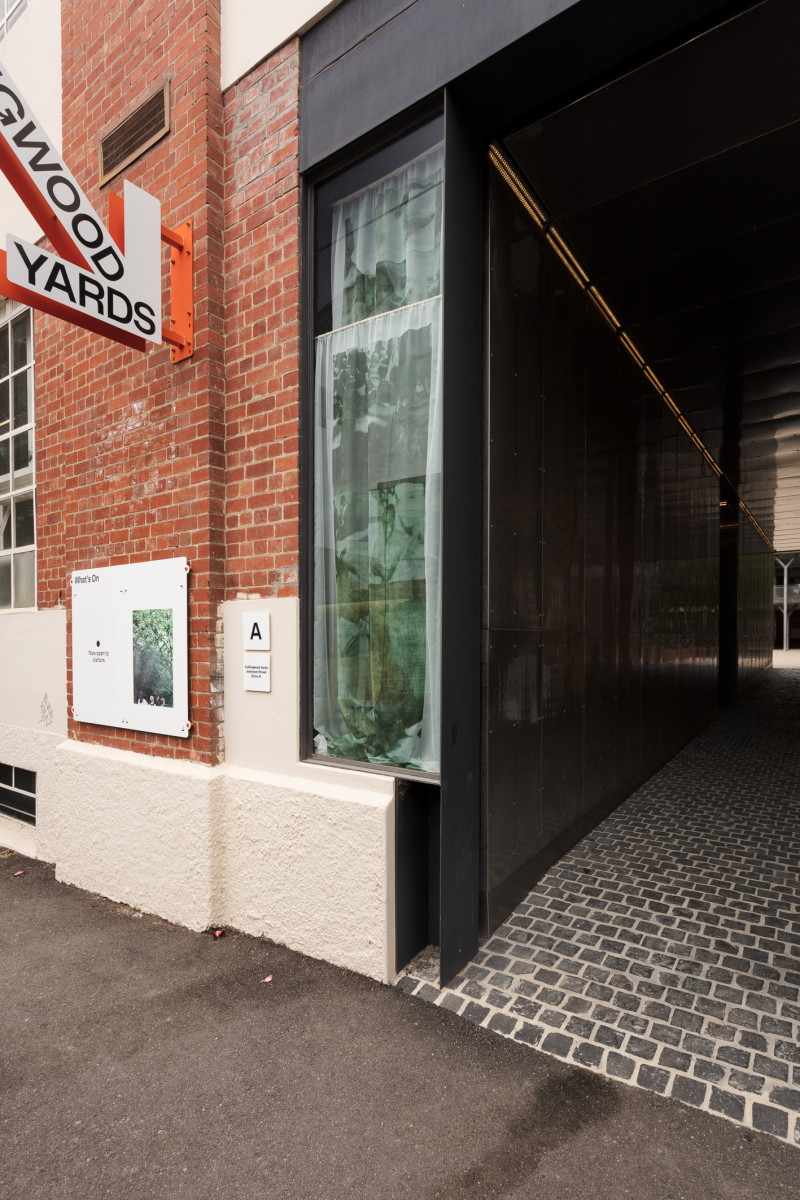 Exhibition disclaimer: This work was initially installed with both fabric panels suspended from the same height at the top of the window space. However, due to the nature of working with tangible materials the front panel dropped part way down the exhibition enclosure before opening night. The artist has chosen to leave the work untouched in its suspended descention, in support of any further mishaps or organic interventions that may occur as a result of material agency.