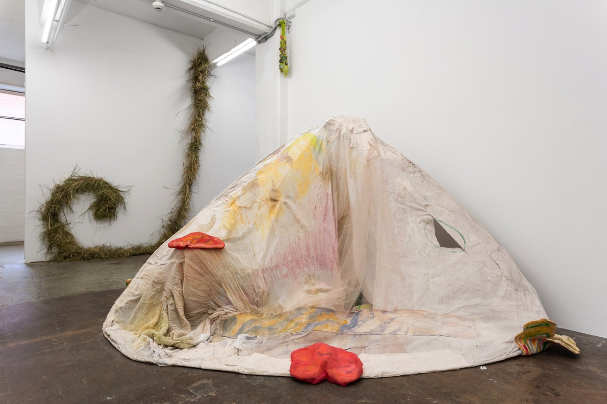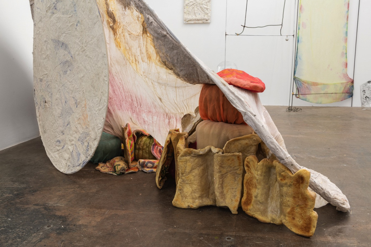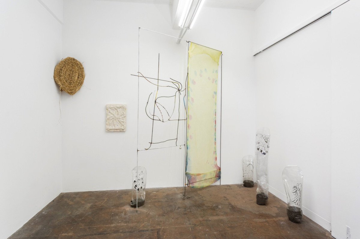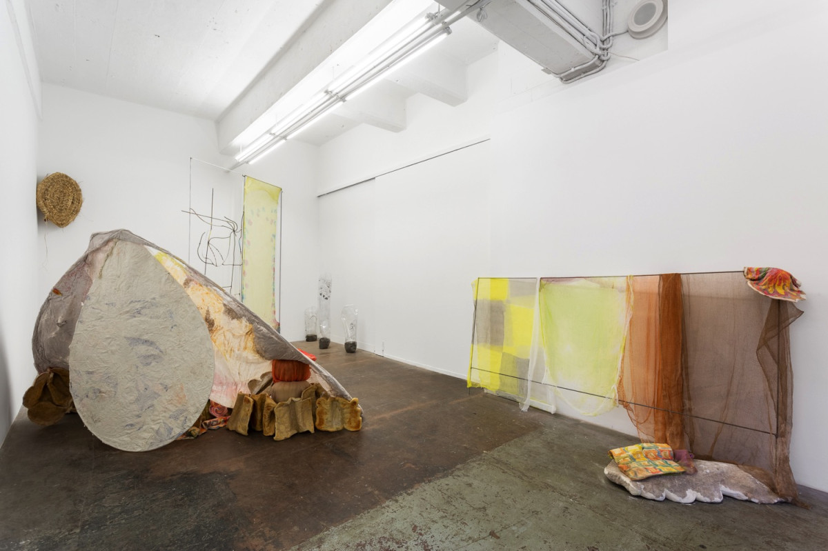 Flirtacious Energy embodies the coalescing of two distinctly experimental and material practices. Using the idea of ‘dressing’ or ‘undressing’ the gallery as a point of departure, each artist uniquely applies a sort of soft architecture to the body of the space. Thinking about the layering and accumulation of material on to and into the work through gesture, the show seeks to create a space that merges the intimate language of clothing and textiles with the structural, domestic codes of fixings. Pockets and pleats emerge as facultative accessories, ruching and dyeing become methods towards structural interventions.