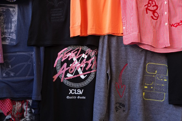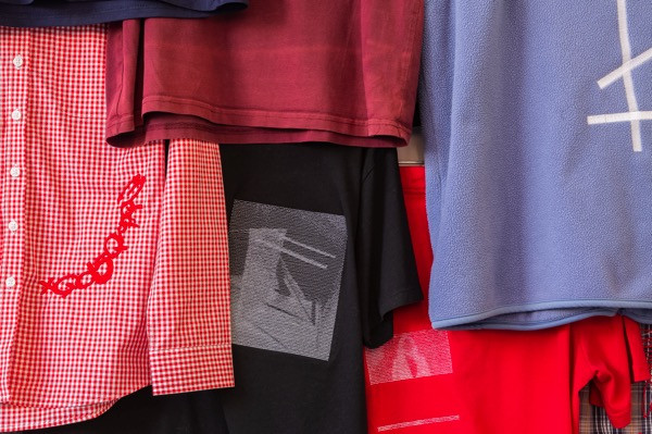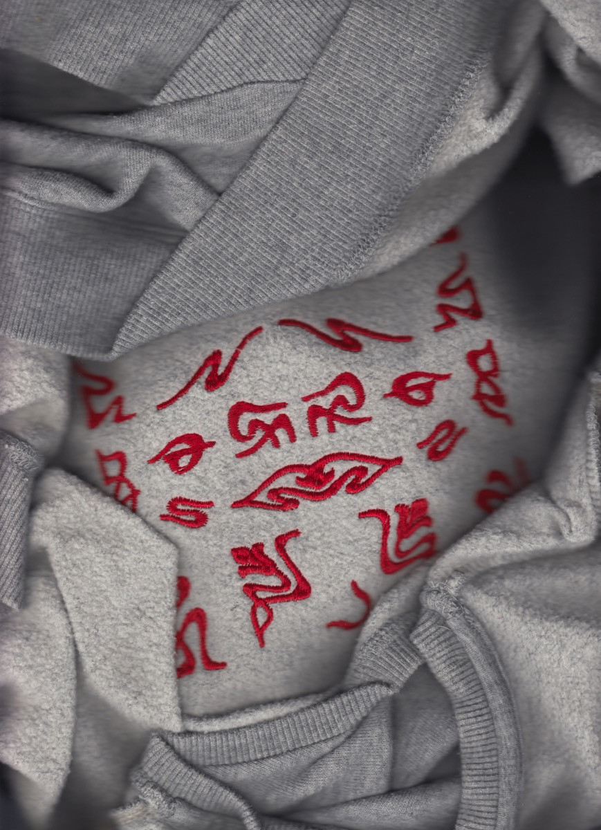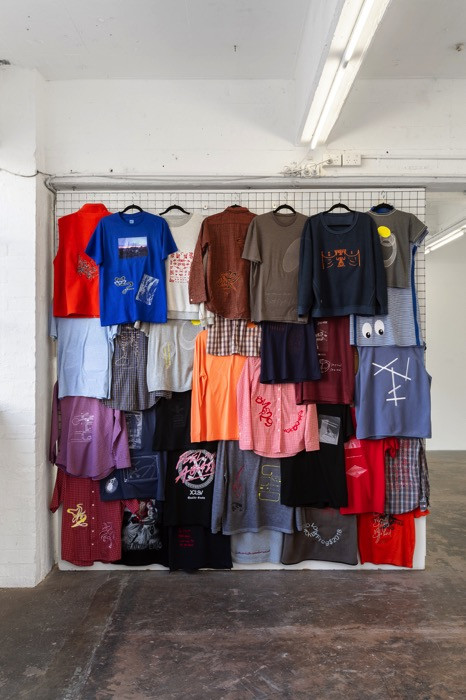 Within this show, clothes contain messages that lie somewhere between the Civil Contract Party’s two-worded logo-slogan and the coded, addressing themes of illegibility, cryptography and the multiverse in relation to graphics, language and also the textile medium they are adhered with/to.