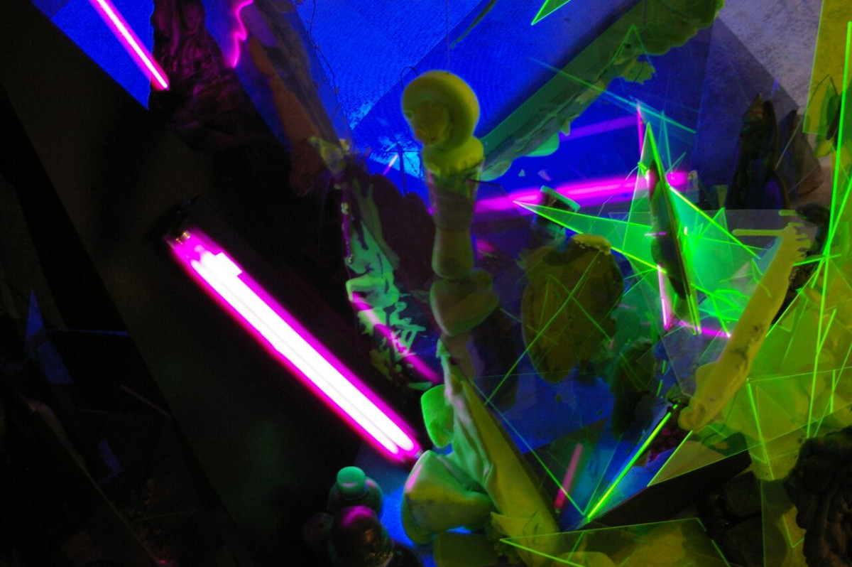 The space between construction and de-construction, growth and decay and their interdependence on one another is a point at which I begin my material investigations. Waste as a vessel for creation, and in the process creating more waste; that waste building upon itself, partially with my assistance and to a degree to its own accord to form a new landscape. Plastics and resins, fluoro and glowing, cheap tricks and a spectral show, a Lego display of a fictional future, mass production within a studio, objects churned out, weak brittle arrogant, growing upon each other as salt crystals, fungus, bacteria. The concept of ‘nature’ is dissected and reinterpreted as the environments we inhabit continually change through the advancement of technology. I am interested in investigating the open possibilities of the constructed ‘nature’ of our times and the wrestle between the constructed environment and the elements that slip outside our control. As opposed to the museum display capturing a memory of an environment past, I seek to utilise the language of the diorama to present a landscape in flux, with scale and subject situated between the imaginary and the immediate.