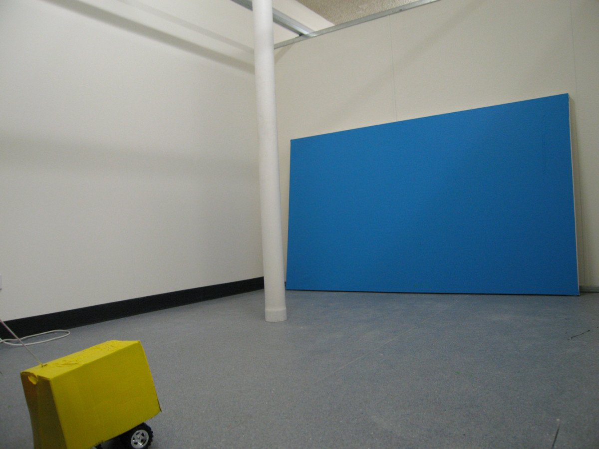The work is made from painted cardboard boxes placed casually on top of remote-control cars, which perform different functions in a studio environment. I am using these forms to animate the play of light and colour in the shifting relationship between the actual and the representational. This allows the mobile object to become a type of moving colour field behind the frame of the camera screen. In some instances these moving boxes become the instrument used to paint. I want to make a “moving painting”, and this depends on the moveable object’s navigations through space.