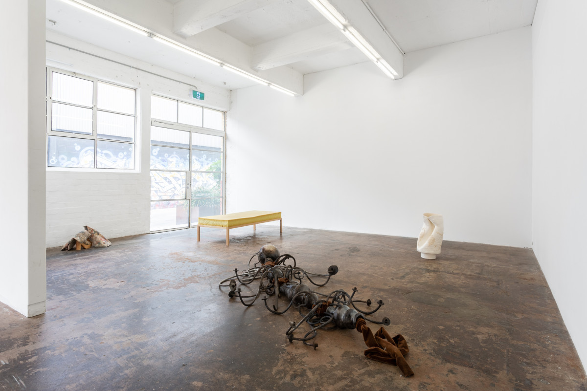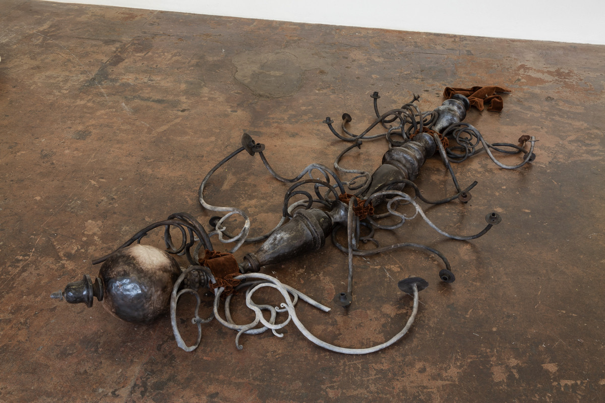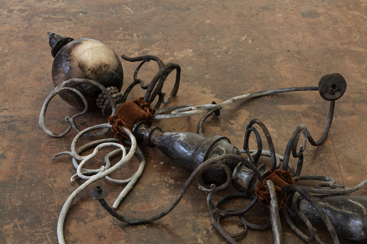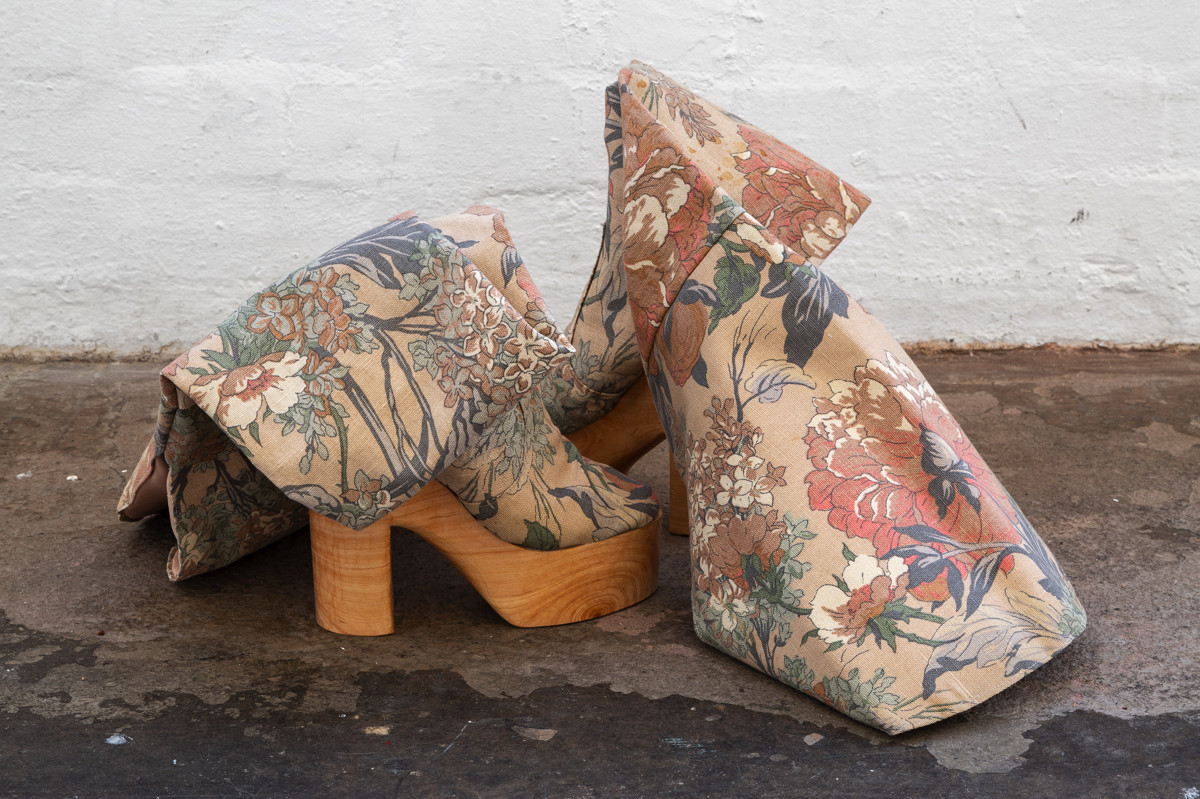 ‘Cooled pride, roused ardour’ investigates the artists queer identity through objects of personal worth. A pit-fired ceramic chandelier stands in for a body. A pair of high heeled boots sit nearby, their fabric taken from a family sofa, itself an old wedding present to his parents. On the floor, a pot depicting the martyrdom of St Sebastian is sheathed in a sacramental stole made by his mother.