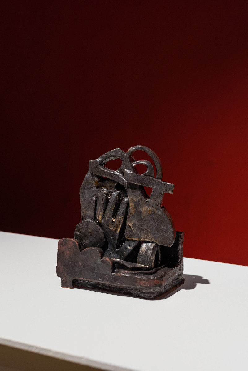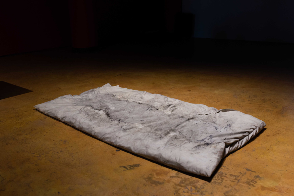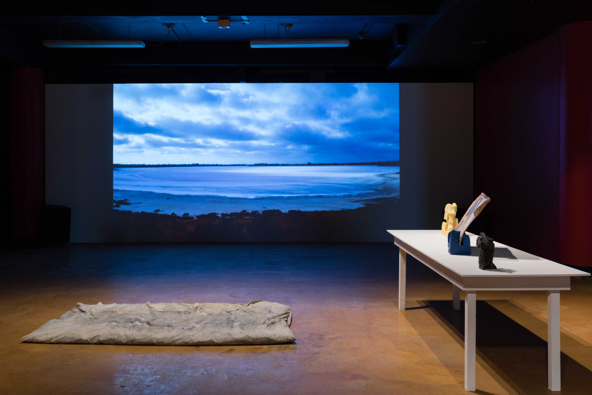 The exhibition includes a large scale video projection ‘The Spectral Field’ by Polly Stanton, a moving image and sound work that traces the delicate and hidden aspects of the ancient Mallee landscape. By documenting the land through cinemas ability to look and listen, the work considers the Mallee as a hauntological space that is both material and meditated. Alongside this sit a series of ceramic sculptures crafted by Kate Tucker. These handcrafted organic forms reference hand gestures from instruction manuals — illustrating notions of care both to oneself and to another. A collection of hand dyed pillow works by Katie West lay on the floor. These cushions are filled with hessian from an unknown source, and eucalyptus and banksia leaves collected on Lutruwita. Their repurposed fabric coverings are dyed with eucalyptus leaves collected in Naarm. They are an offering of a place for human bodies to rest and be with others.