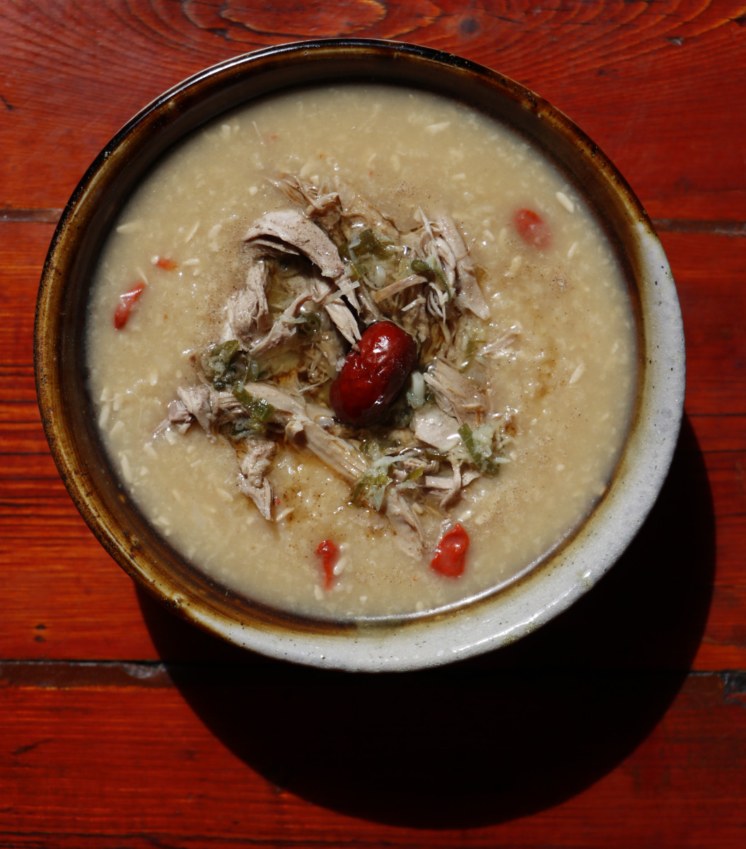 This is a sticky-sweet-savoury congee made with a rich chicken and duck stock. Aromatics in the soup include ginger, ginseng root, ganangal, Solomon’s seal, root of the Holy Ghost and white pepper. The sweetness comes from fermented rice, red dates and goji berries. The stickiness from glutinous rice and collagen from the two birds.