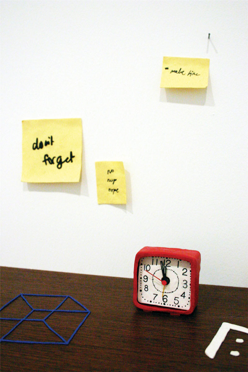 If a cluttered desk is a cluttered mind, then a desk is a surface you can lay your psyche out on. The Artist reproduces a fictional working space as installation, softening the distinctions between function and aesthetics, between making and the made, and raising a dialogue about dimensionality, practice and representation. The tools and artefacts associated with working are reproduced in Fimo, reducing the diversity of real world detritus to an artificial uniformity of surface and dysfunctionality. Here, models of things reiterate themselves; objects become segues, tools become sculpture, drawings become things. The pieces cumulatively suggest the potential for both productive labour and for playful time-wasting.