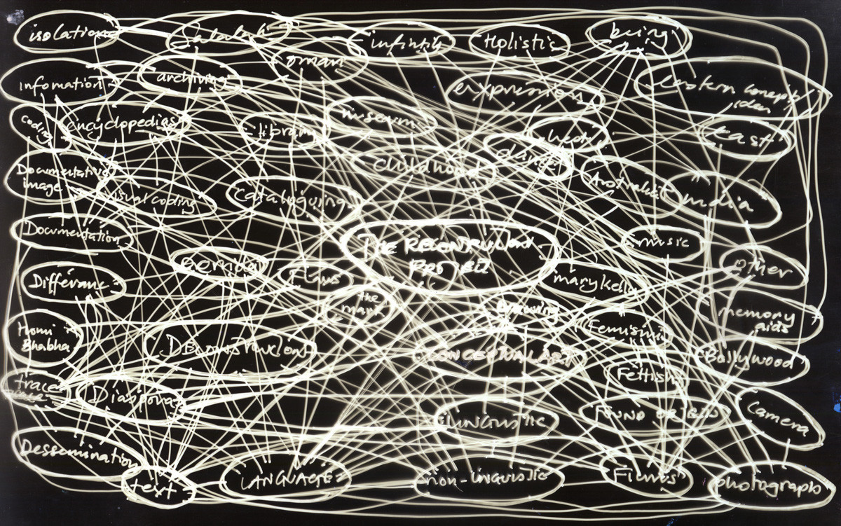 ‘The Reconstruction Project’ (2002-current) is an on-going exercise in and an exploration of a cultural/existentially deconstructed subject who attempts to reconstruct their identity through structures present within language which provide boundaries of understanding. In this current project the artist/subject traces back to her liminal attempts to conceptualise, realise and understand elements of this project and of her identity by creating conceptual diagrams (aka = brain maps, ideas maps, concept maps). Conceptual diagrams are commonly used to demonstrate of ideas, concepts, theories, to clarify concepts, to theorise. In this case the artist attempts to find clarity… clarity in her identity by conceptualising through several demonstrative diagrams which become obsessive because one is never suffice. How one is defined, never ends in this place because one is in a state of continual reconstruction, recreation, and revaluation, faced with countless cultural possibilities, translations and interpretations. Being lost in translation is a reality. I am investigating this space in my project between my pluralistic position through a these diagrams. What is understood is only understood in the moment. Clarity is temporal…