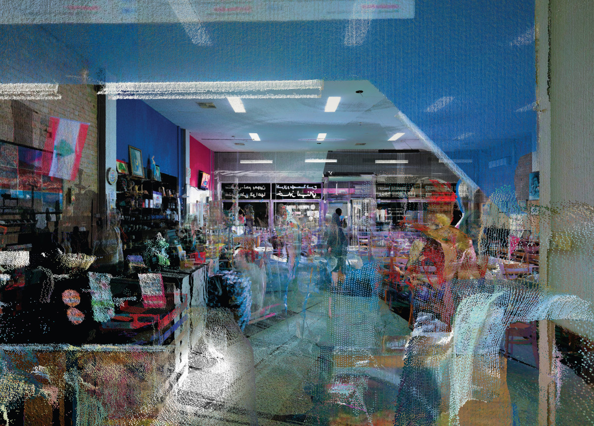 Roland Barthes famously wrote that “the nature of a photograph is not to represent but to memorialise.” What is the nature of a LiDAR scan? Multitudes, probably. We can only vaguely speculate on future uses of this technology. Farro’s scans of Vice and Brunswick offer one vision. The works are a perversion of the LiDAR scanner’s primary purpose—to replicate the exact spatial dimensions of an area. Instead, his practice is a memorialisation of peripheral suburban mundanity, one that runs in opposition to common uses of the technology, such as documenting a building site or a ruin of Great Historical Significance. In those scans, human presence is rendered important only in absence, in the service of the towering, depersonalised achievements of built longevity. In Terrestrial Landscapes, human presence is centred. The stills mutate against precision. Farro could remove the glitched figures with a tool designed exactly for that; he doesn’t. He could smooth over the warped negative spaces; he doesn’t. By fucking it up, or rather refusing to enact the illusory process of unfucking it up, Farro refutes the idea of technology as a tool of objective capture. Questions of accuracy are superseded by questions of epistemology.