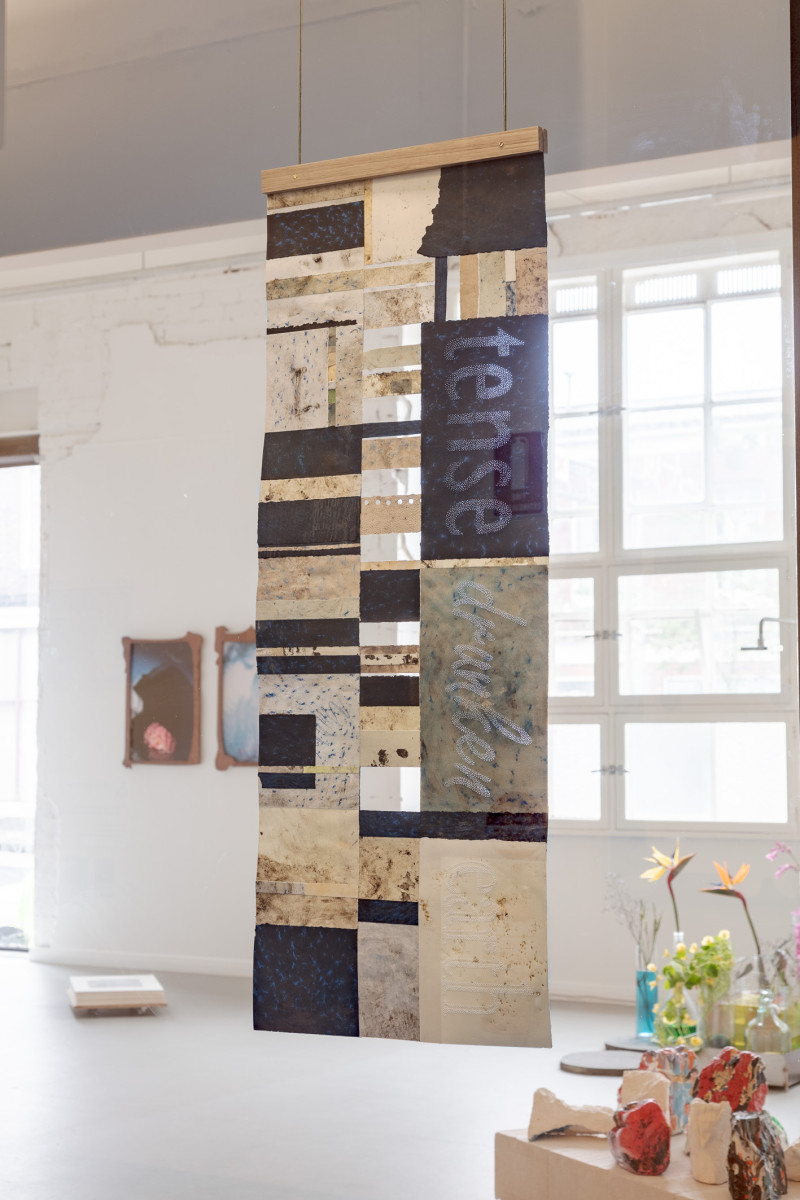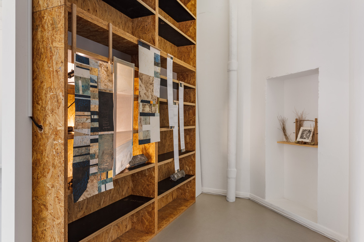 As a site of intergenerational and material recuperation, this exhibition honours the artist’s grandfather’s labours during those years: of hands immersed in earth; of diligent tasks of stitching, incorporating, building. Against this history of brutal enforced labours rendering tyrannical monuments, these renditions envision new blueprints that dwell in the soft bodies of local Merri Creek clays and their vegetal and bacterial kin, as found around the artist’s home in Fawkner. Impressions of these bodies carried through papers and gum arabic polymer both support and affectively divest from the holding of hard, intrusive rock used to fortify the colonial settler state of so-called Australia—the land to which Antoni migrated in 1949—thereby also foregrounding the difficult histories of our current sites for knowledge production.