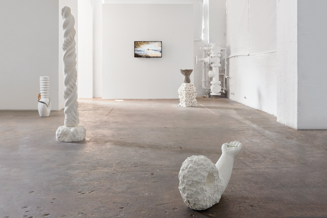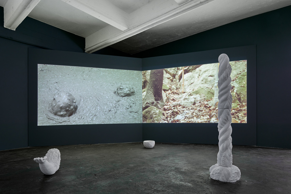 For the exhibition at Bus Projects, Noriko will present a new body of sculptural and video works, alongside Ratman’s large scale video installation, ‘The 588 Project’. ‘The 588 Project’ is an absurd and phantasmagorical exploration of connectivity between the natural and manmade, and depicts a series of heads submerged in mud in a forest. Noriko’s limestone sculptures will be presented in tandem with Ratman’s installation, allowing for a percolation of ideas to brew, submerge and cross-pollinate between each other.